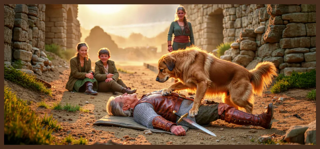 Pax stretched his legs and immediately began sniffing around Ronan’s large boots. The rough soldier was still snoring as loudly as before. Apparently, he had gone to sleep with a few crumbs still clinging to his clothes, for Pax climbed onto his chest and began digging about enthusiastically with his large snout.